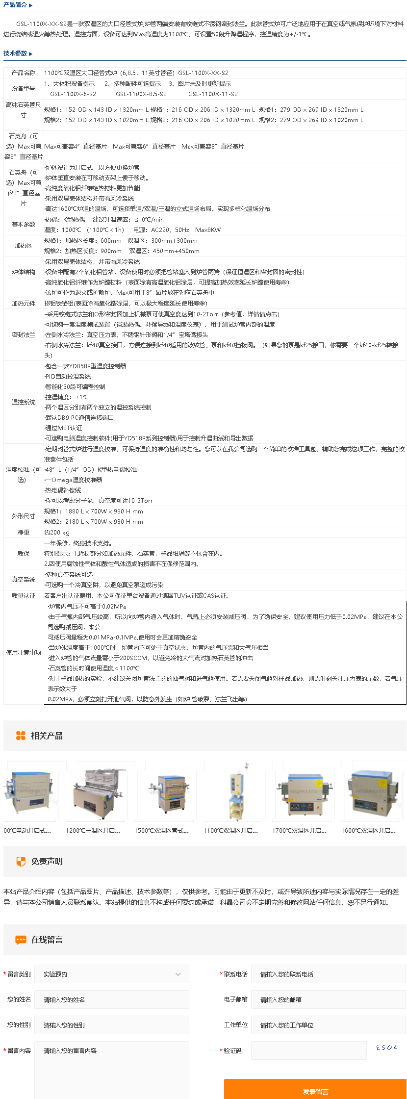1100℃双温区大口径管式炉(6,8.5,11英寸管径)GSL-1100X-XX-S2