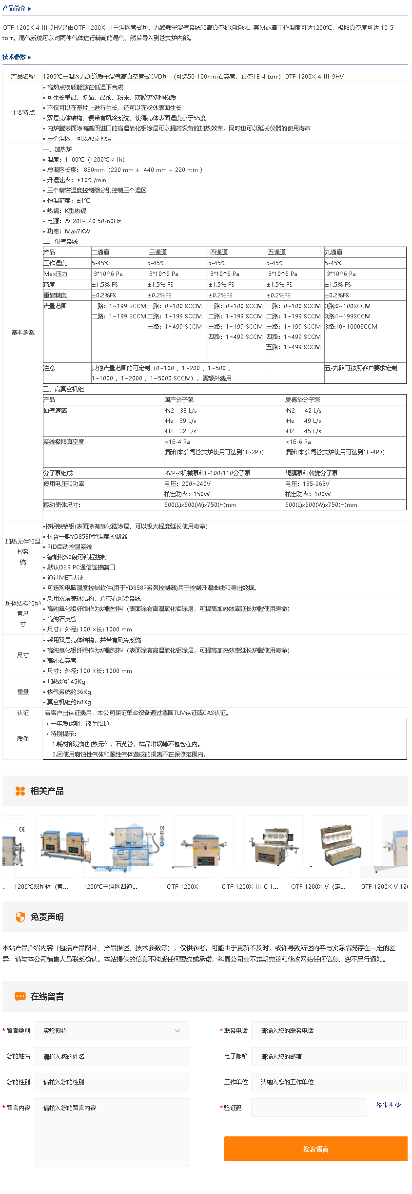 1200℃三温区九通道质子混气高真空管式CVD炉 (可选50-100mm石英管,真空1E-4 torr)OTF-1200X-4-III-9HV