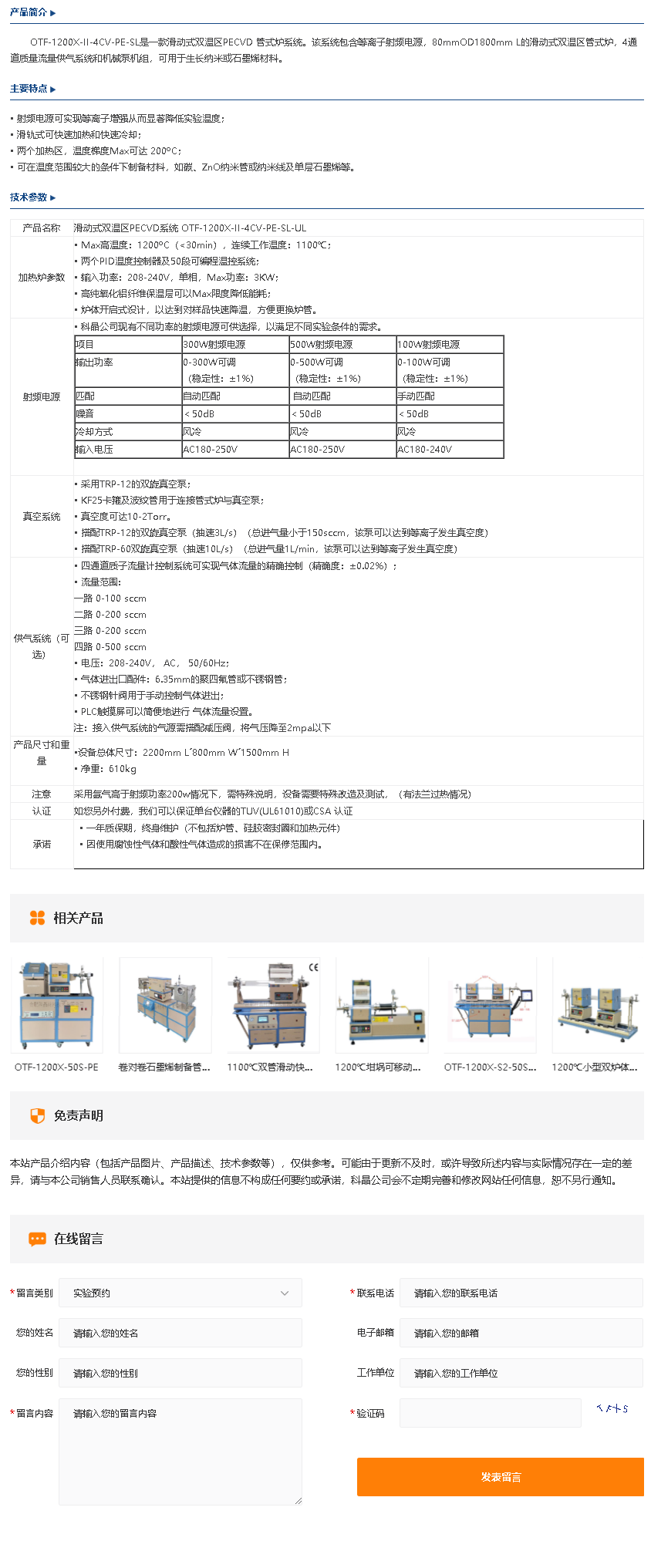 滑动式双温区PECVD系统 OTF-1200X-II-4CV-PE-SL-UL