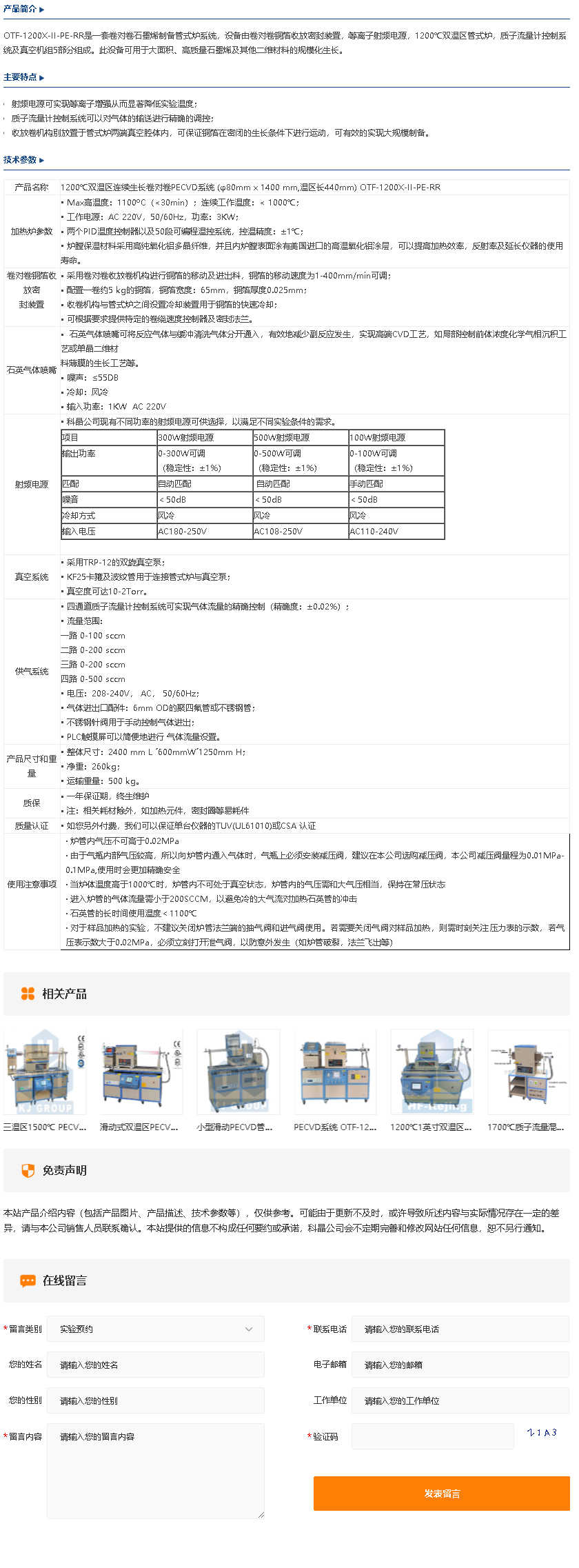1200℃双温区连续生长卷对卷PECVD系统 OTF-1200X-II-PE-RR