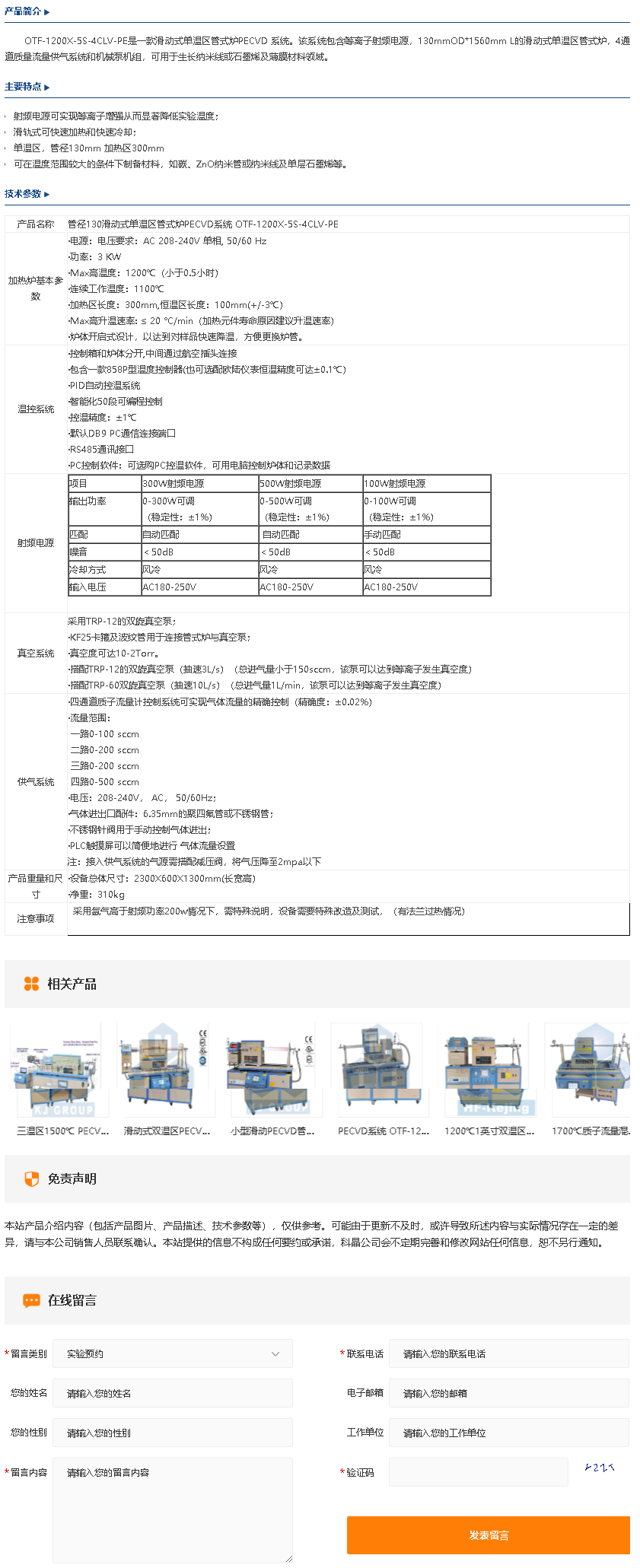 管径130滑动式单温区管式炉PECVD系统 OTF-1200X-5S-4CLV-PE